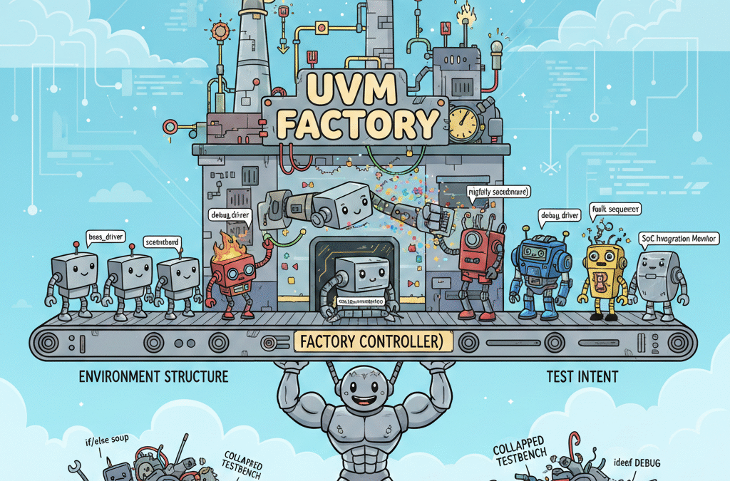 If you read most explanations of the UVM factory, they begin with APIs. They explain set_type_override_by_type(), show a minimal example, and stop there. What’s missing is the architectural context: Why experienced verification engineers depend on the factory in real projects.